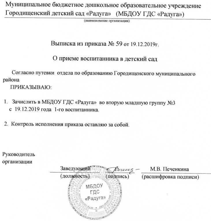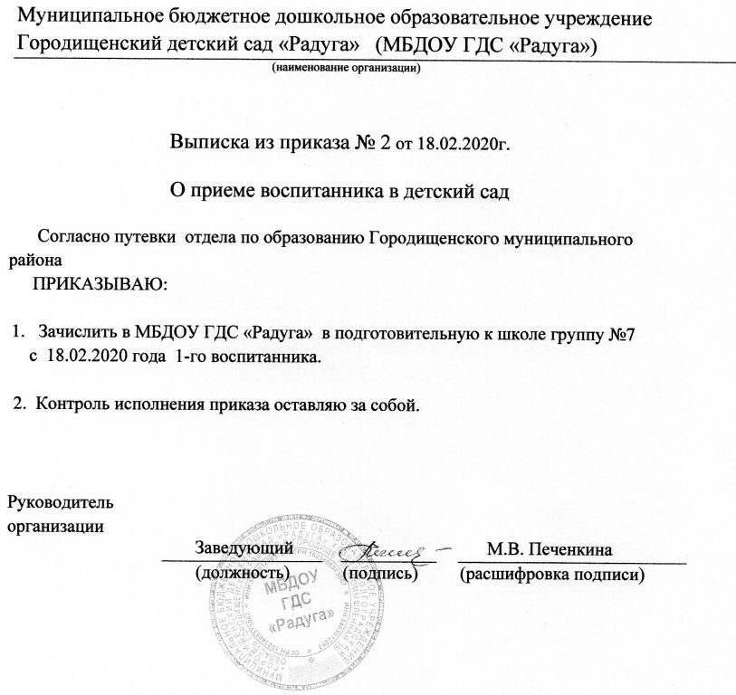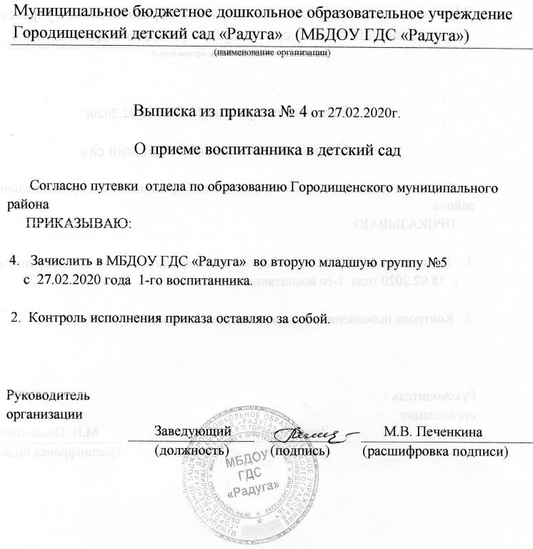Выписка из приказа №7 от 03.04.2020 о приеме воспитанника в детский сад (скачать) (посмотреть)